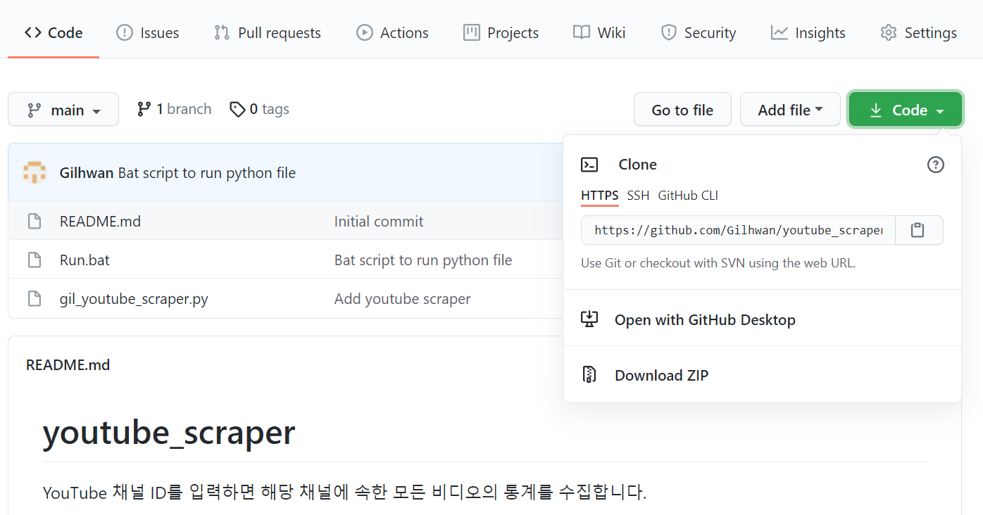 https://github.com/Gilhwan/youtube_scraper에 접속하면, 파일을 다운로드할 수 있습니다. 아래에서 code > Download Zip을 하시면 됩니다.